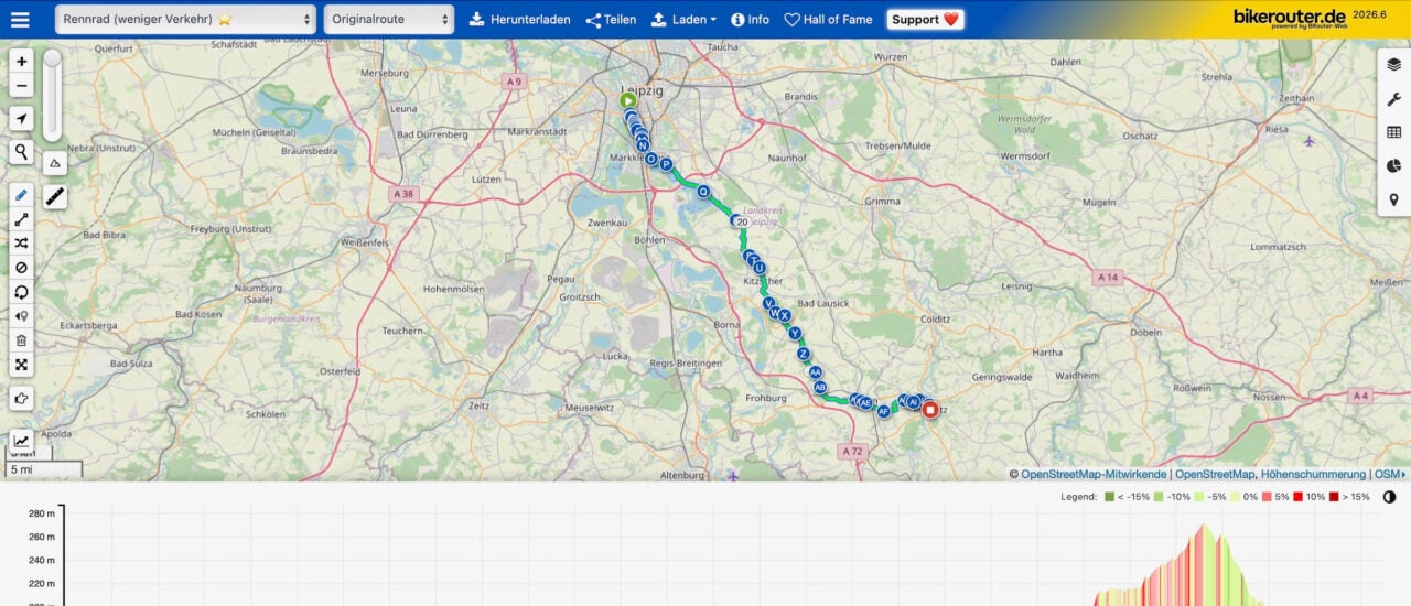 Ich weiß nicht, wie es dir geht, aber ich versuche sowas zu meiden. Ja, und mir fällt da gleich noch das nächste ein, was man vielleicht noch dazu sagen kann. Was ich auch super finde, ist also ich nutze den Bike Router, so dass ich nicht einfach sage, in Potsdam geht es los, in Cottbus geht es weiter, sondern ich mache es relativ kleinteilig. Also ich kann immer irgendwie auf die Route klicken und mir dann einen neuen Wegpunkt irgendwo hinziehen und das ganz feinklietrig auch gestalten.