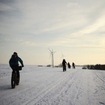 Das „Karl Ranseier Raubelwalzer Quintett“ aus Dresden zelebriert solche Schneeausfahrten in jedem Winter. Die vier Freunde haben vor vier Jahren angefangen, mit Fatbikes zu experimentieren. Für den einen ist das dicke Ding ein reines Winterrad, der andere fährt damit auch im Sommer auf Trails und setzt es sogar bei Enduro-Rennen ein. Dass Fatbikes zumindest im Winter erste Wahl sind, darauf können sich alle einigen.