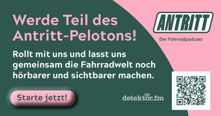 Wir sind davon überzeugt, dass wir den Antritt zusammen mit euch noch viel weiter entwickeln können. Wir sehen unzählige Geschichten aus der Fahrradwelt, die mehr Aufmerksamkeit verdienen. Wir denken an neue Serien im Antritt, noch mehr Live-Podcasts und vielleicht auch Antritt zum Hören und Sehen in Form von Video-Podcasts. Wir möchten euch in Zukunft noch stärker beteiligen, die Themen unserer Community einbeziehen und natürlich unsere journalistische Unabhängigkeit wahren. Dafür brauchen wir ein weiter wachsendes Peloton und laden euch ein: Rollt mit uns, lasst uns gegenseitig Windschatten geben und gemeinsam die Fahrradwelt noch hörbarer und sichtbarer machen.