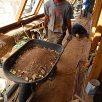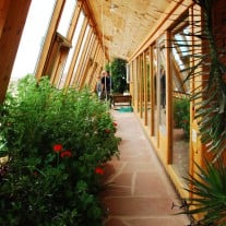 Dazu wird es Richtung Süden gebaut und ein Gewächshaus mit einer großen Fensterfront vorgelagert. Tagsüber, während die Sonne scheint, wird die dadurch gewonnene Wärme im Haus gefangen. Darüber hinaus lädt sich währenddessen eine Thermalbatterie auf, die die gespeicherte Wärme wieder abgibt, wenn keine Sonne mehr scheint. Gedämmt wird die Rückseite des Hauses mit Wänden aus Autoreifen und viel Erde.